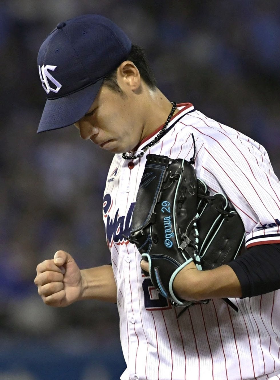 7回DeNA2死一塁、倉本を一ゴロに打ち取りガッツポーズするヤクルト先発の小川=神宮【写真提供:共同通信社】