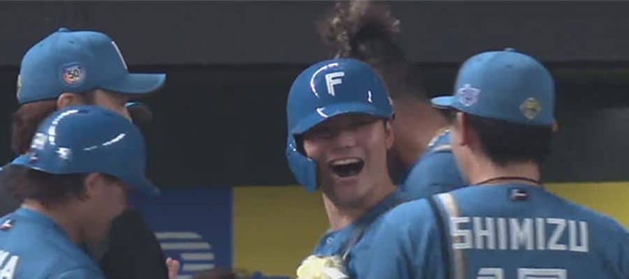 日本ハムは4回に先制するも、先発・山崎福也投手が6回に西川愛也外野手に適時打を浴びて同点に。7回に1死から連打を浴びたところで降板した。試合は延長戦へ突入。すると、10回に万波中正外野手の遊ゴロの間に勝ち越し。なおも2死二塁で清宮幸太郎内野手の1号2ランが生まれ、3点のリードを得る。10回は、この日1軍復帰した田中正義投手が3者凡退で締めた。