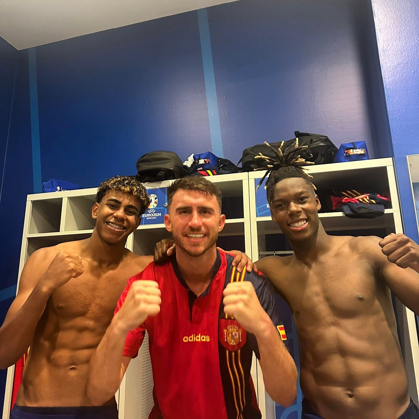 「Con mi personal 💪🏼😁」と綴り、1枚の写真をアップ。同じスペイン代表のラミン・ヤマルとニコ・ウィリアムズとのロッカールームでの様子を公開した。