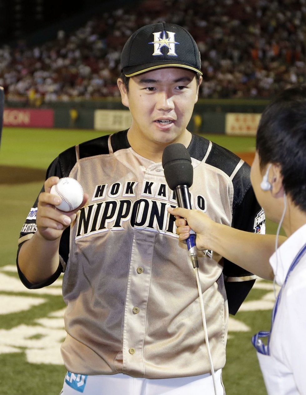 プロ初本塁打のボールを手に、インタビューに応える日本ハム・横尾=Koboパーク宮城【写真提供:共同通信社】 北海道日本ハ…