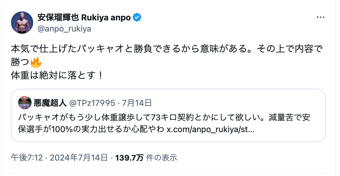 14日、格闘家の安保瑠輝也が自身のX(旧Twitter)を更新。マニー・パッキャオ戦に向け減量中の安保にファンがポスト。…