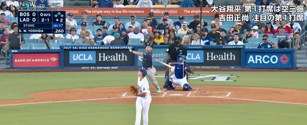両チーム無得点で迎えた2回表、吉田が先頭打者で第1打席に立つと、カウント2-1からの4球目を捉える。打球はライト方向へぐんぐん伸びていくも、あとひと伸びが足りずライトフライに倒れた。飛距離358フィート(109.1メートル)の打球は、データサイトの「Baseball savant」によると、MLBの本拠地30球場中、9つの球場でホームランになっているほどの大きい当たりだったものの、ライトフライに終わった。