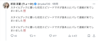 YouTuber、TikTokerとして活躍するインフルエンサーの折田涼夏が自身のXを更新した。【画像】今日好き出身人気…