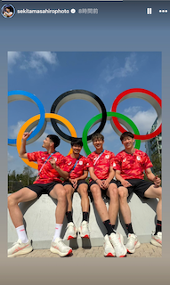 五輪のマークの前で、高橋健太郎、小野寺太志、石川祐希らとのオフショットを投稿した。