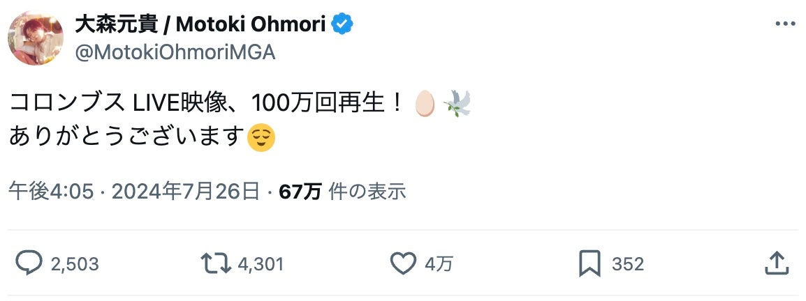 大森元貴が大ヒット曲「コロンブス」の100万再生をお祝い! | 話題の投稿