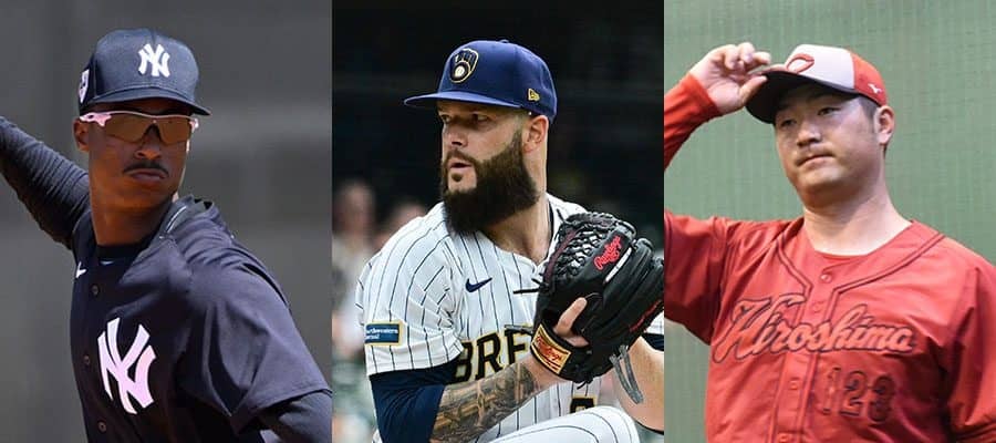 ジーター・ダウンズ、ダラス・カイケル、岡田明丈(左から)【写真:Getty Images、ロイター、真田一平】
