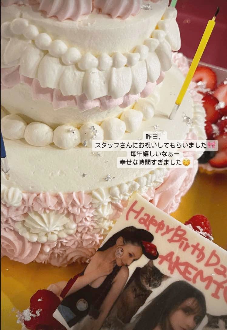 写真には「Happy Birth Day AKEMI」と書かれたプレートとケーキが写されている。