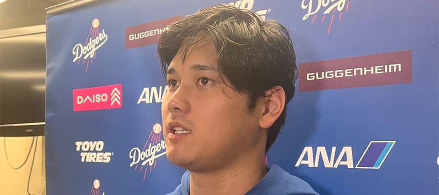 試合後の取材を受けたドジャース・大谷翔平【写真:川村虎大】