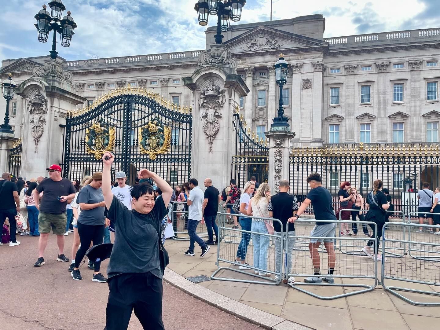 「せっかくのバッキンガム宮殿での写真で帽子が飛んでいってしまう残念なあたくし。」と綴り、バッキンガム宮殿バックで半目になってしまった自身の写真を複数枚投稿。「#半目でもあるし #拡大して見ないでね」とハッシュタグをつけた。