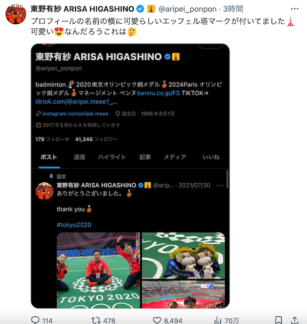 バドミントン選手の東野有紗が4日、自身のXを更新した。【画像】オリンピックで活躍中・バスケ富樫勇樹が31歳の誕生日!「プ…