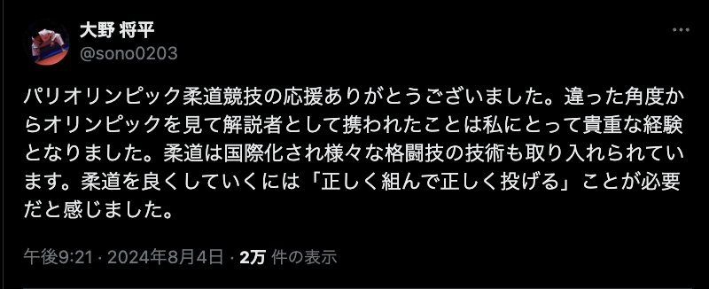 「柔道を良くしていくには...」解説者・大野将平がパリ五輪柔道競技の感想を綴る。 | 話題の投稿