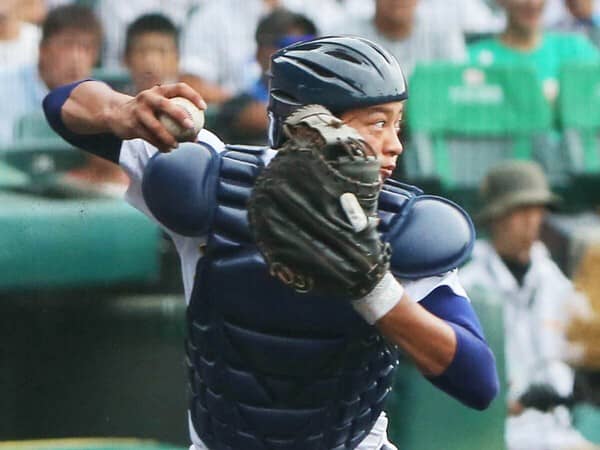 遠投100メートルの肩を生かした送球は、ピッチャーがモーションに入ってからセカンドに到達するまでの最高タイムが3.3秒。捕球してからだと1.9秒と、高校生ながらプロ並みの速さでピッチャーをサポートする。