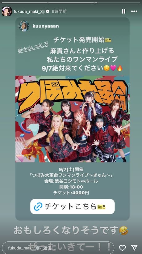 福田はストーリーズで、「麻貴さんと作り上げる私たちのワンマンライブ、9月7日絶対来てください」