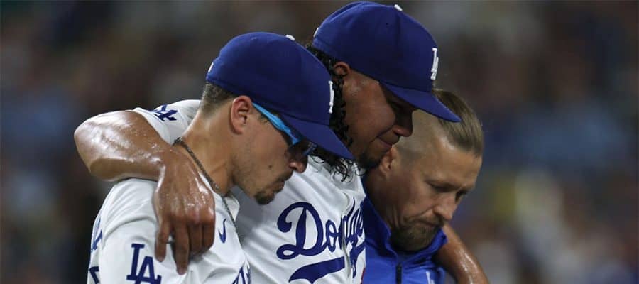 負傷降板したドジャースのブルスター・グラテロル(中央)【写真:Getty Images】