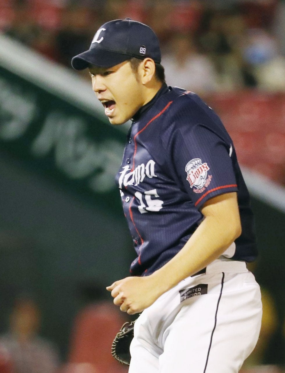 9回、最後の打者聖沢を空振り三振に仕留め、雄たけびを上げる西武・菊池。完投で13勝目を挙げた=Koboパーク宮城【写真提供:共同通信社】