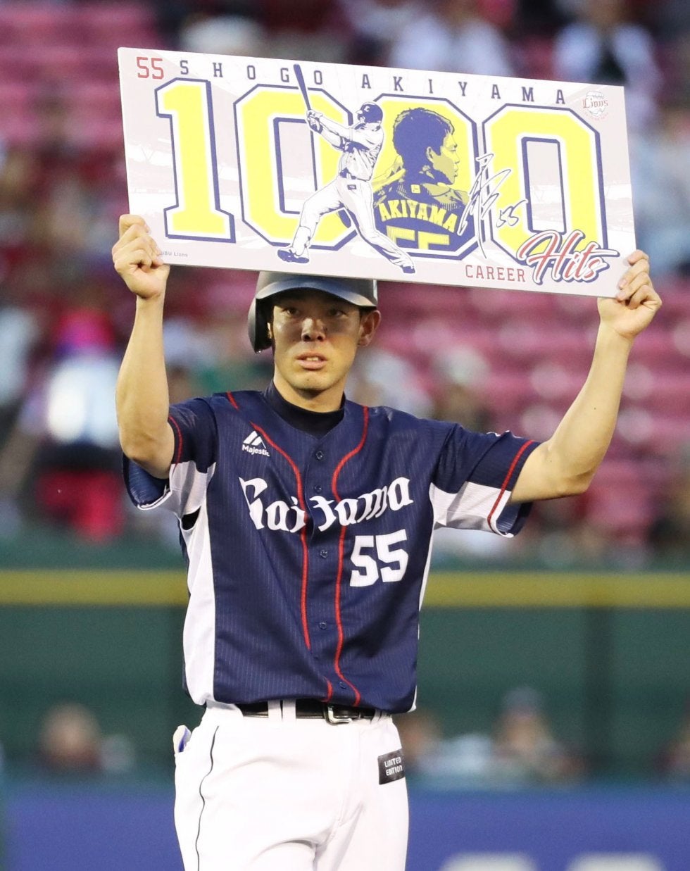 1回、通算千安打を達成し、ボードを掲げる西武・秋山=Koboパーク宮城【写真提供:共同通信社】 埼玉西武の秋山が31日の…
