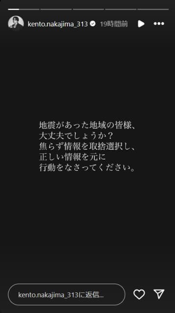 中島健人インスタ更新「正しい情報を元に行動を」日向灘の地震に気遣い | 話題の投稿