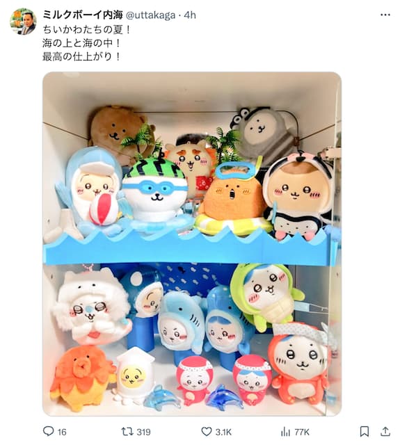 お笑い芸人ミルクボーイの内海崇が9日、自身のXアカウントを更新。【画像】王子がちいかわを持ってると話題に「可愛すぎだろ王…