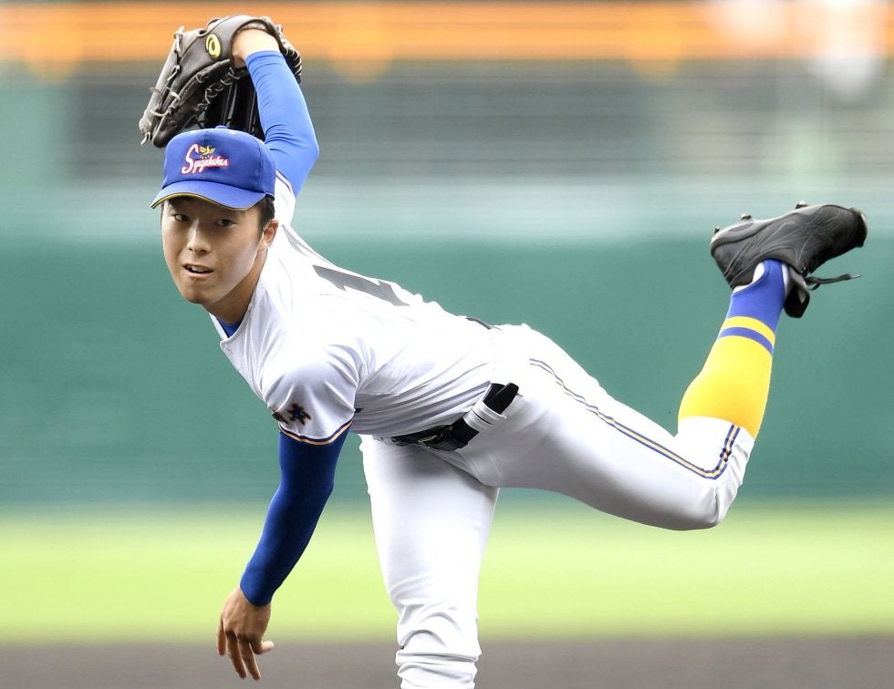 今年の高校生を代表する速球派左腕。右手のグラブを高くつきあげ、テークバックを大きく取って真っ向から振り下ろすフォームから繰り出す速球の最速は148キロ。さらに120キロ台のスライダー、110キロ台のカーブ、120キロ台の落差あるチェンジアップを駆使する。