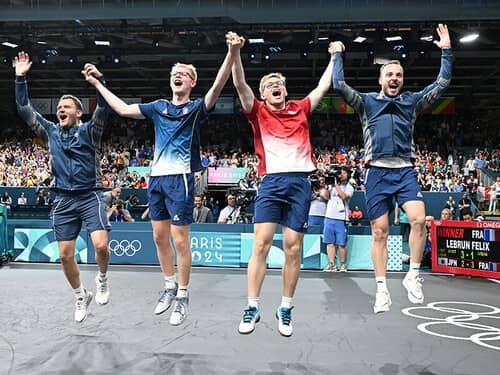 大声援を受けて日本を破って喜ぶフランスの卓球男子団体の選手たちphoto by JMPA