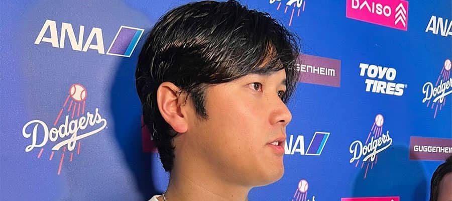 試合後に取材に応じたドジャース・大谷翔平【写真:川村虎大】