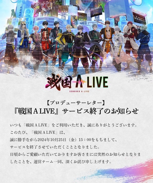 リズムゲームアプリ『戦国 A LIVE』が2024年10月25日(金)にサービスを終了することが決定。【画像】「刀剣乱舞…