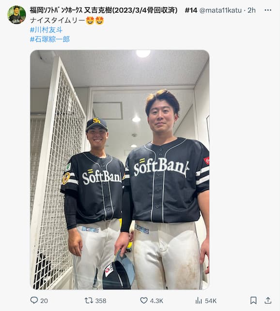 ソフトバンクの又吉克樹投手が13日、自身のXを更新した。【画像】又吉広報 お待ちかね本日の投稿は「9回のスーパープレイ」…