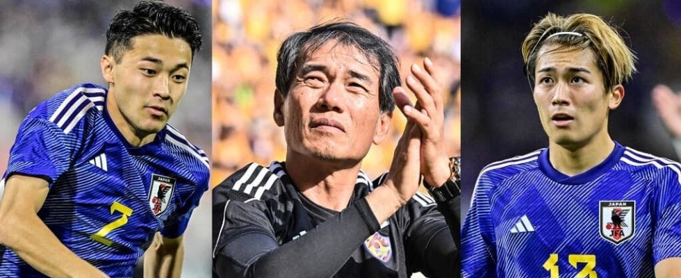 中央:ベガルタ仙台の森山佳郎監督、右:サッカー日本代表MF中村敬斗(写真2枚:中地拓也撮影)、左:サッカー日本代表DF菅原由勢(写真:雑誌協会代表撮影/中地拓也)