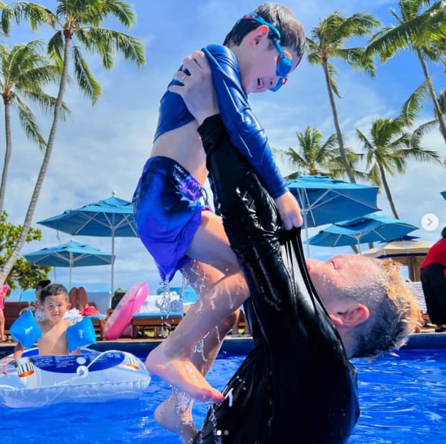 「夏の思ひで、2024、2018」と綴り、息子とプールを楽しむ様子をアップした。