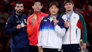 表彰台の記念写真も永瀬(左から2人目)は一歩後ろでうつっている(C)Getty Images 柔道金メダリストの謙虚すぎ…