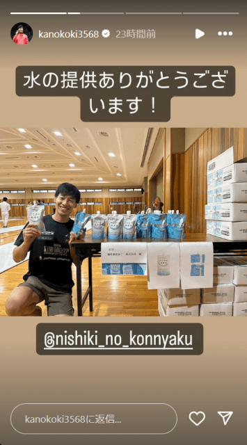 ストーリーで「水の提供ありがとうございます!」と綴り、笑顔の写真を公開した。