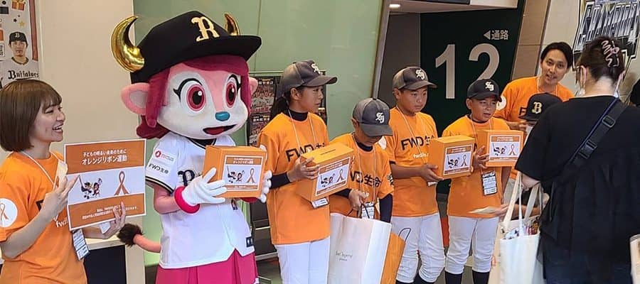 子どもの虐待防止へ「オレンジリボン運動デイ」開催 Bs戦前に学童選手が呼びかけ