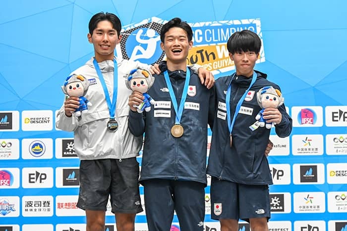 U-20男子リード表彰台に上がった(右から)小俣、杉本