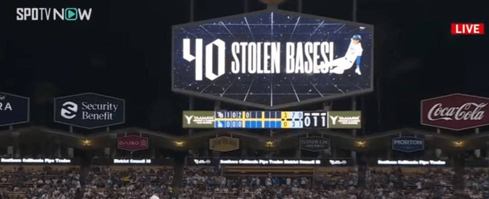 盗塁を決めた直後、ビジョンには「40 STOLEN BASES」と表示され、本拠地ドジャースタジアムの粋な演出に多くのファンから拍手喝采。ドジャースタジアムのボルテージは一気に上がった。
