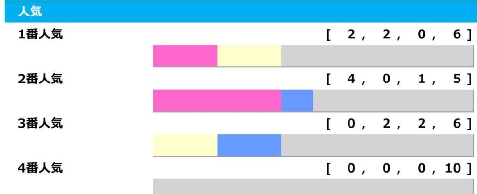 過去10年、1番人気が【2.2.0.6】連対率は40.0%をマークするが、2019年から5年連続で馬券外に飛んでおり、10着、10着、13着、5着、7着と近年は大不振。一方、2番人気が【4.0.1.5】で近5年では【3.0.1.1】と好調。3番人気は【0.2.2.6】で勝利こそないが近5年では【0.2.1.2】と、馬券外2頭も掲示板内に来ており、大崩れなく善戦中。1番人気に代わって2番人気と3番人気が台頭する形となっている。