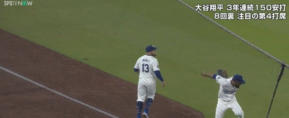 ドジャースの大谷翔平投手が「1番・DH」でスタメン出場したオリオールズ戦で8回、打ち上がった打球を追いかけ捕球したマンシーが、テオスカー・ヘルナンデスに対してちょっとしたイタズラをしかける場面があった。直後のT・ヘルナンデスの大リアクションにファンもほっこりした。