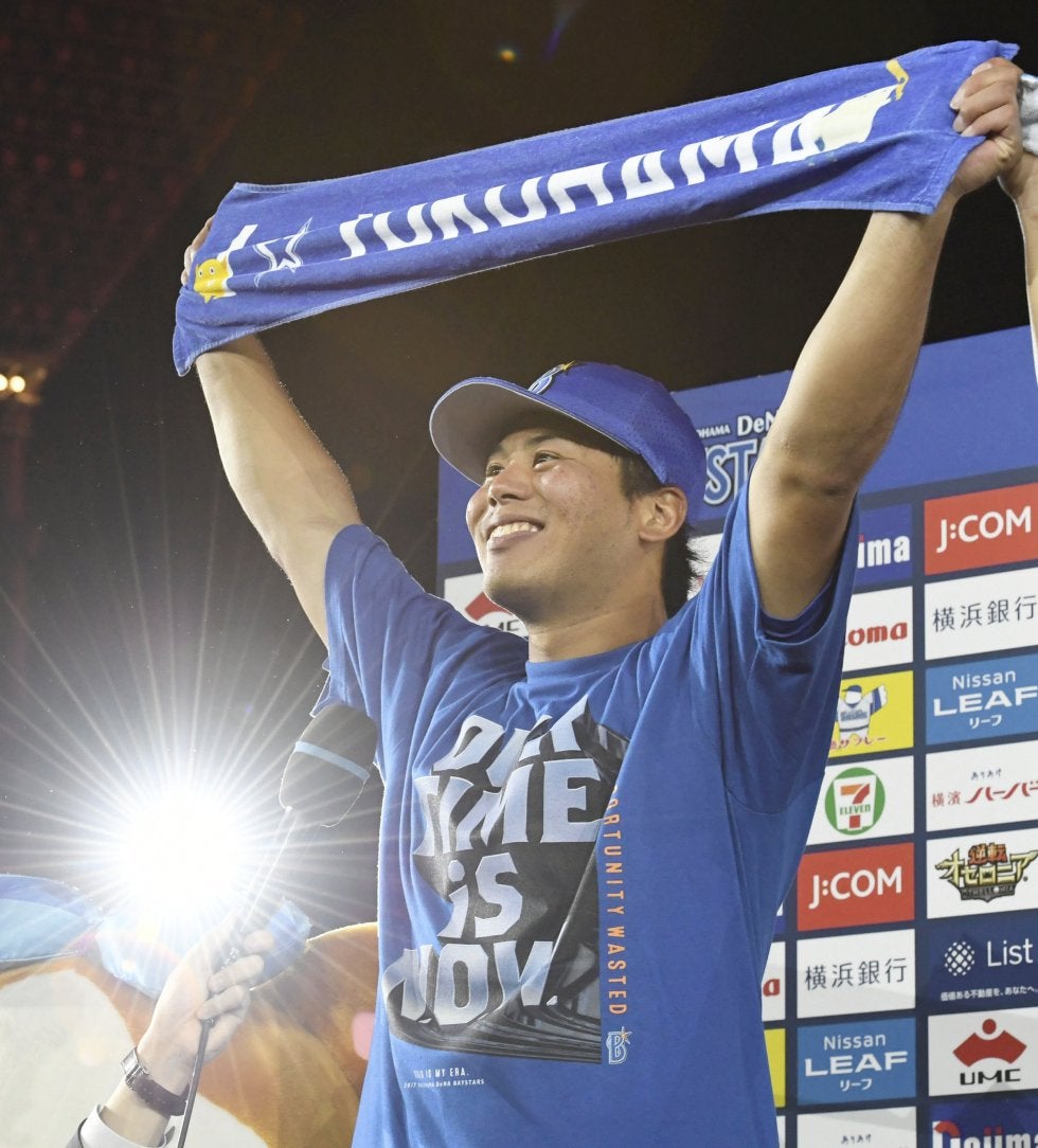 9勝目を挙げ、お立ち台でファンの声援に応えるDeNA・浜口=横浜【写真提供:共同通信社】終盤の好機をモノにした横浜DeN…