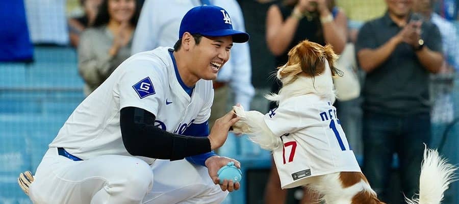 始球式に登場したドジャース・大谷翔平(左)と愛犬デコピン【写真:松本洸】