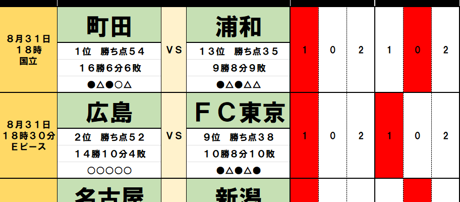 広島の勝利に加えて、首位交代のもう一つの条件は、町田が引き分け以下の結果に終わること。おそらく、この対戦は引き分けになりそうだ。