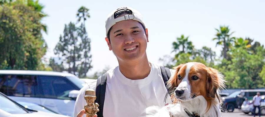 金のボブルヘッドを手に持つドジャース・大谷翔平(左)と愛犬デコピン(写真はスクリーンショット)