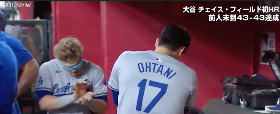 連日のように記録を作っていく大谷のプレーに対し、ドジャースナインはお祭り騒ぎ。ダイヤモンドを周回した大谷にネクストバッターズサークルで準備をしていたベッツ内野手、フリーマン内野手はそれぞれハイタッチで大谷を出迎え、さらにベンチでは恒例となったひまわりの種のシャワーで大谷を祝福。その後、テオスカー・ヘルナンデス外野手ら他のチームメートからも大谷はハイタッチを求められた。