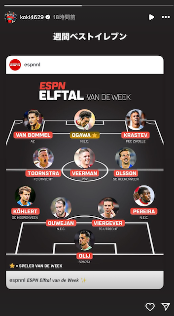 オランダ1部NECナイメヘンに所属する小川は、シッタート戦で今季初ゴールとなる先制点を挙げ、週間ベストイレブンに選ばれた。