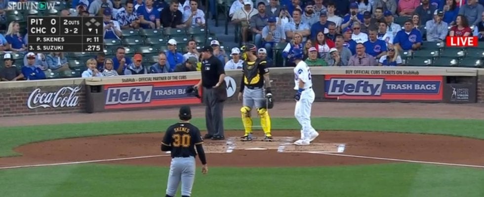 際どい判定に相手陣営がブチギレた。カブスの鈴木誠也外野手が「3番・DH」でパイレーツ戦に先発出場した初回、第1打席はカウント2-2からのストレートが外角に外れてボール。鈴木は自信をもって見送ったが、パイレーツの“怪物新人”と呼ばれる先発ポール・スキーンズは思わず“二度見”して「マジかよ」という表情。さらには相手監督も激昂する事態に発展したが、審判は毅然とした態度で“ボール”を宣告。ファンも「これは普通にボール」と冷静だ。
