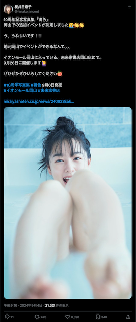 桜井日奈子、写真集発売の追加イベントが決定!「地元岡山でイベントができるなんて、、、」 | 話題の投稿