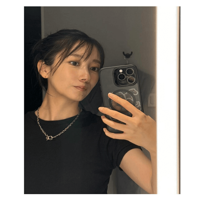 鏡を前に、プライベート感満点の自撮りは、黒のトップスにネックレスが映える。