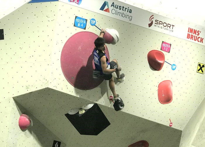 まず女子で注目を集めたのは先日のリードW杯デビューを果たした白石阿島だ。昨年までのユースBでリード、ボルダーともに連覇を達成している白石は、ユースAでも安定したクライミングを披露。もっとも会場を湧かせたのは第2課題。ルーフからスタートする課題に誰もが苦戦し、米国のブルック・ラバトウのみがなんとかボーナスを掴むという展開のなか、最終競技者の白石は最初のトライでボーナスを掴みかけると、2トライ目でうまく修正しそのまま完登。続く第3、第4課題は連続の一撃で唯一の全4完登を達成し、他を寄せ付けない強さで優勝を果たした。2位にはロシアのルイザ・エメレワ、3位にはラバトウが入り、米国勢2人が表彰台に立つ結果に。日本の小島果琳、中村真緒は残念ながらともに予選で敗退となっている。