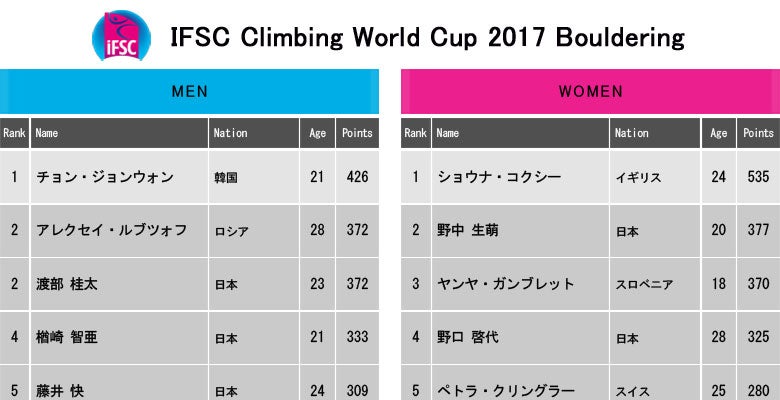 そして渡部以外でも、最終戦での活躍が期待される日本代表選手が目白押し。7月のワールドゲームズでボルダリング種目金メダルを獲得し好調の緒方良行や、八王子大会でファイナリストとなった石松大晟も日本山岳・スポーツクライミング協会の推薦で出場する。そして女子では、年間優勝こそショウナ・コクシーで確定しているものの、2位以下は未確定。野中生萌、ヤンヤ・ガンブレット、野口啓代による三つ巴の争いにも注目だ。2017年シーズンの締めくくりとなる本大会でも、日本人選手たちが最高のパフォーマンスを発揮できることに期待したい。