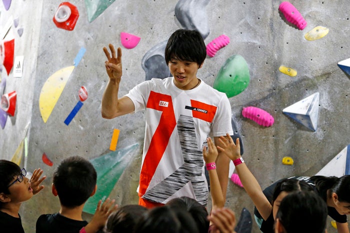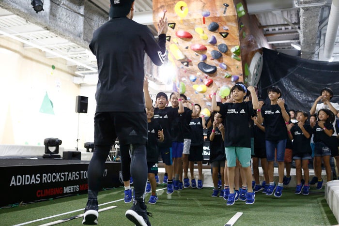 前日に予選が行われ迎えた16日、午前の部ではこどもたちを対象にした「YOUNG ATHLETES CHALLENGE」を開催。「こどもじゃない。挑戦者だ。」をコンセプトに、前半はアディダスが考案するレベルの高い動きに必要なリズムを養う「リズミックトレーニング」を体験。後半には安間佐千、野中生萌、藤井快によるボルダリングセッションが行われた。3グループに分かれて各選手のレッスンを受け、参加したこどもは「足の使い方のアドバイスをもらって、できない課題ができるようになった」と、トップ選手の的確なアドバイスでレベルアップを体感した様子だった。