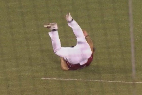 4回にライナーに急襲され、尻もちをついて直撃まぬかれる