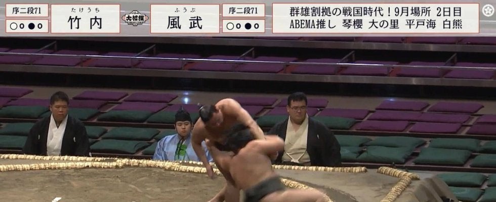 その後の序二段七十一枚目・竹内(音羽山)との取組では、左四つに組んでからやや長い攻防を繰り広げたが、最後は風武が相手を叩きつけるような強烈な掬い投げで勝利。風武は今場所初白星となる1勝目を挙げた。敗れた竹内は1敗目を喫した。